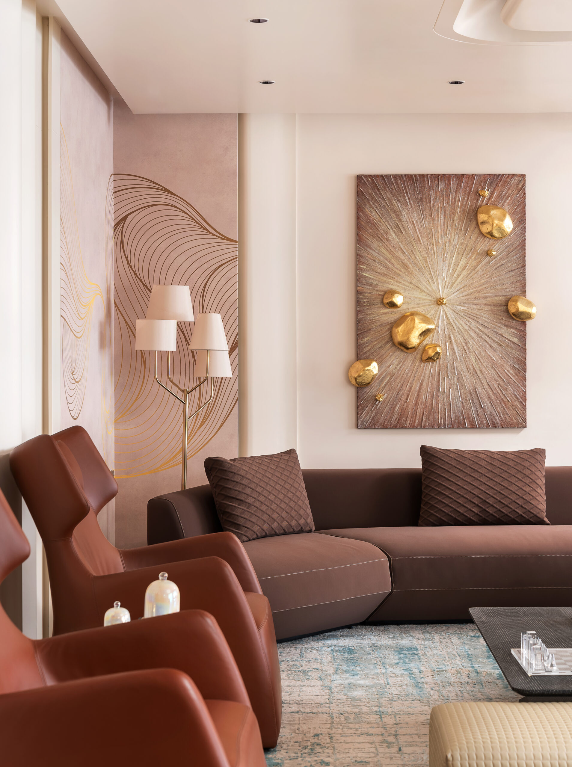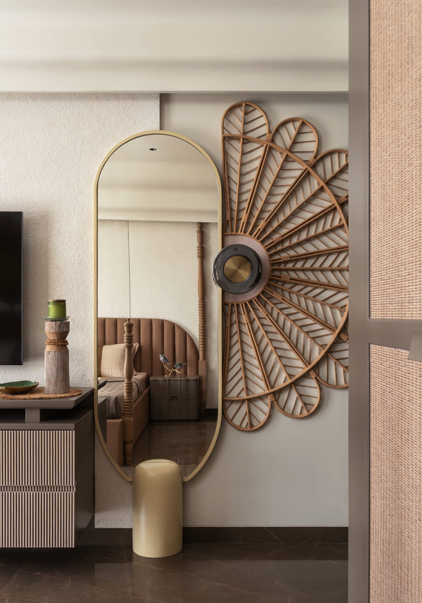 From cane-textured wardrobes to bespoke mirrors and golden accents, every element is designed to celebrate art as a lived experience — not a displayed object.