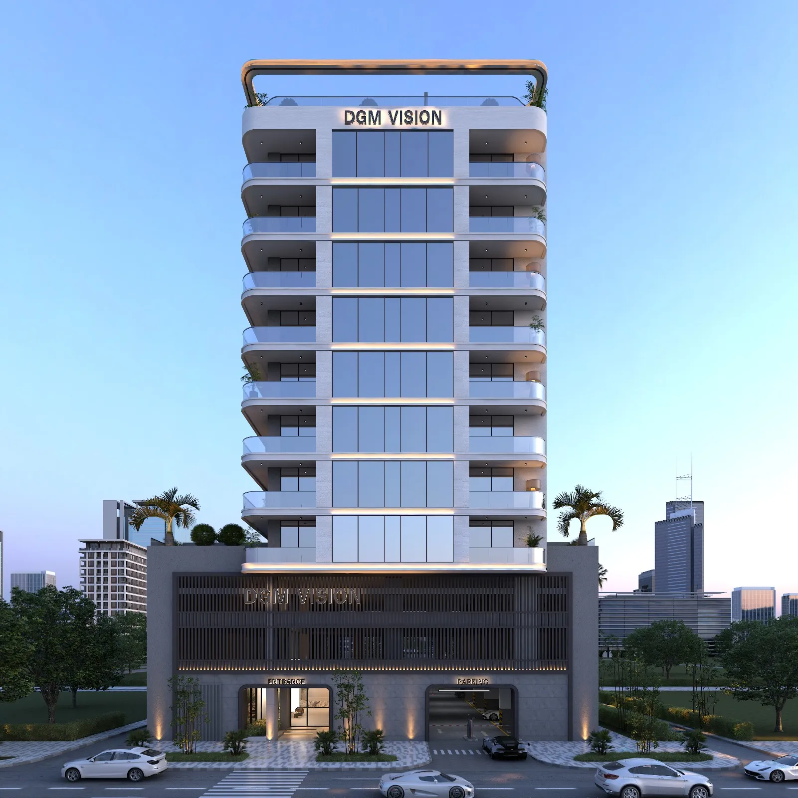 DGM Vision – Pearl is a modern residential tower that reflects clarity, balance, and understated luxury. With its clean vertical lines, soft neutral palette, and rhythmic façade of glass and stone, Pearl offers a serene living experience in the heart of the city. Each apartment opens to spacious balconies framed by sculptural columns, creating a sense of openness while maintaining privacy.