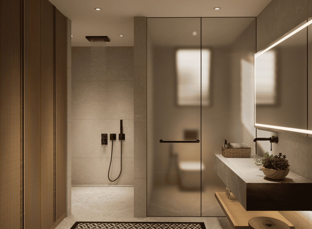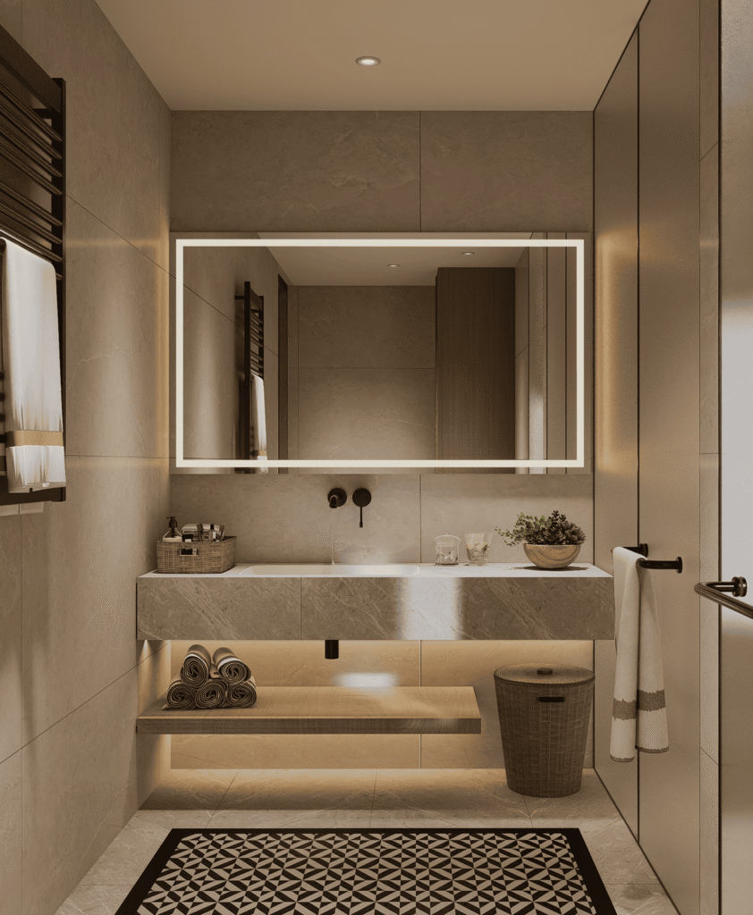 Designed with a focus on minimal sophistication and spa-like tranquility, the resort bathroom features a seamless blend of natural textures, soft lighting, and warm neutral tones. The fluted wood panels, stone finishes, and backlit mirrors create an ambiance of refined comfort. Every element—from the matte fixtures to the subtle greenery—enhances a sense of calm, turning daily rituals into a moment of indulgence.
