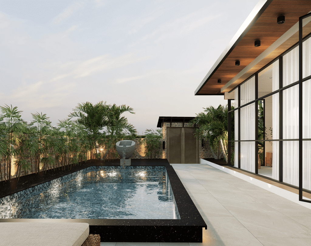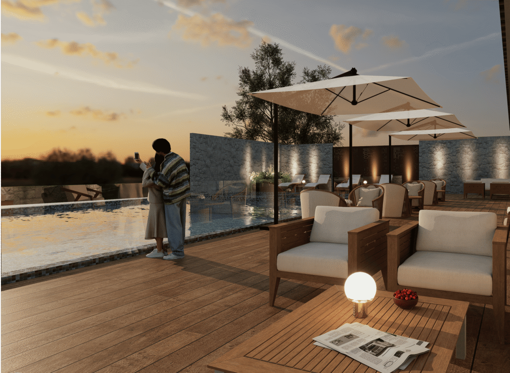 The amenity pool area is designed as a tranquil retreat merging nature and luxury. The layout features natural stone cladding, warm wooden decks, and ambient lighting, enhancing the resort’s serene atmosphere. Thoughtfully placed loungers, shaded cabanas, and cozy seating clusters create zones for relaxation and social gatherings. The reflective water surface and landscaped periphery establish a continuous dialogue between architecture and landscape, evoking a sense of calm sophistication.