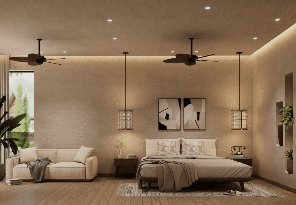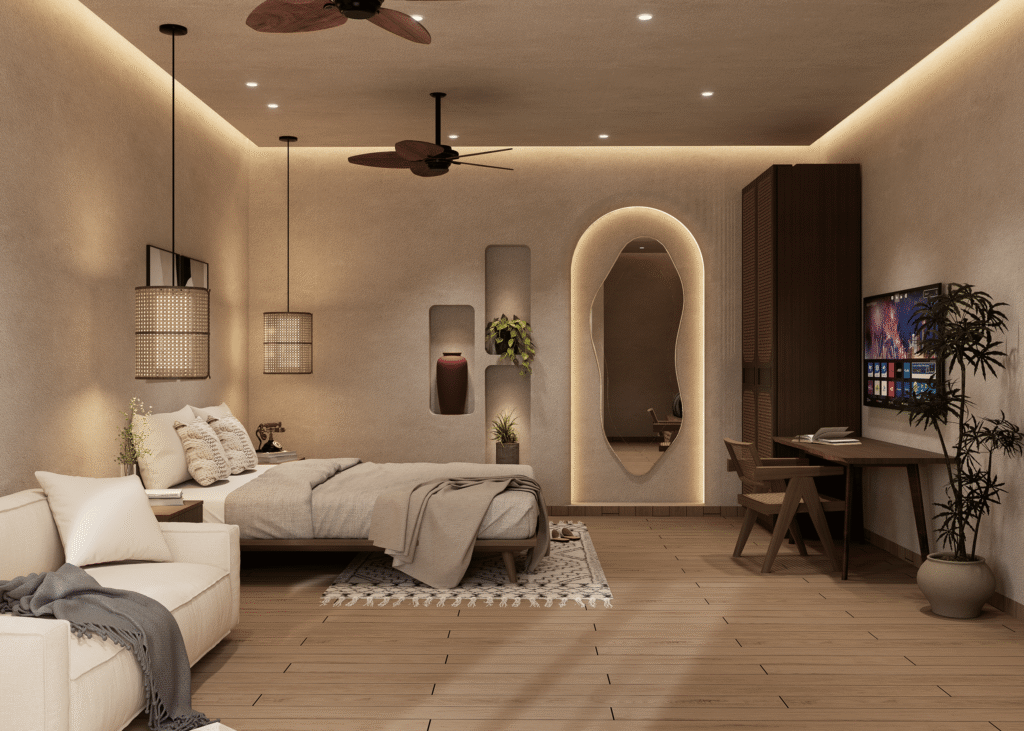 This resort room design exudes earthy elegance and serene minimalism, crafted with warm textures and soft neutral tones. The rattan pendant lights, wooden flooring, and fluted wall niches add artisanal charm, while the ambient cove lighting enhances the tranquil mood. Thoughtfully placed greenery and organic forms create a seamless connection with nature, making the space both inviting and rejuvenating.