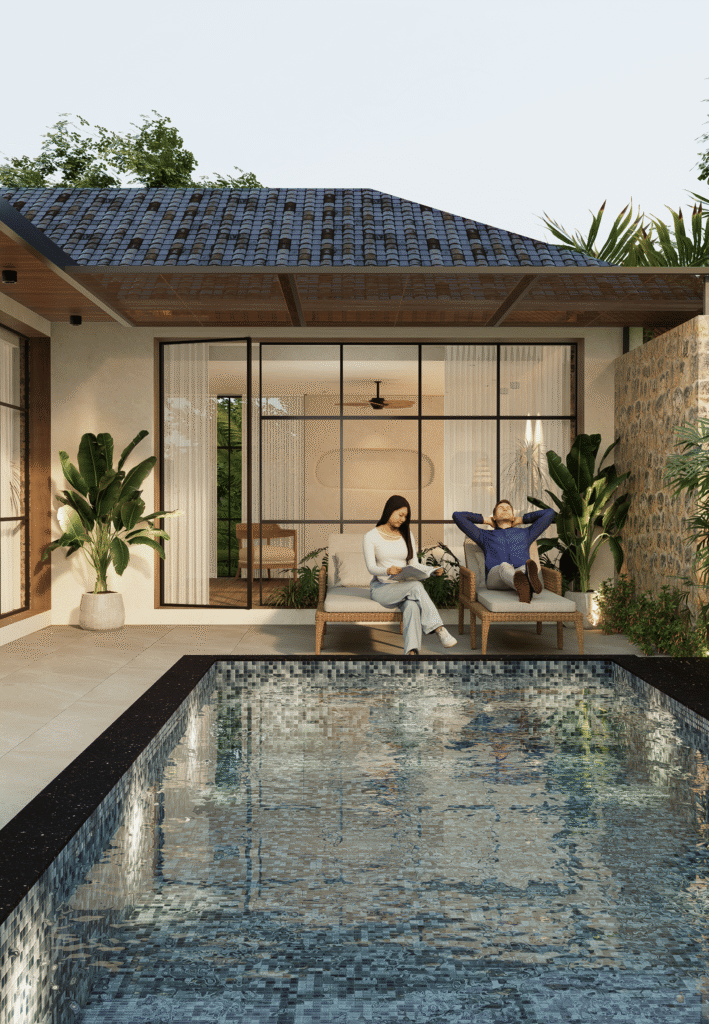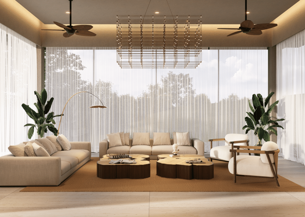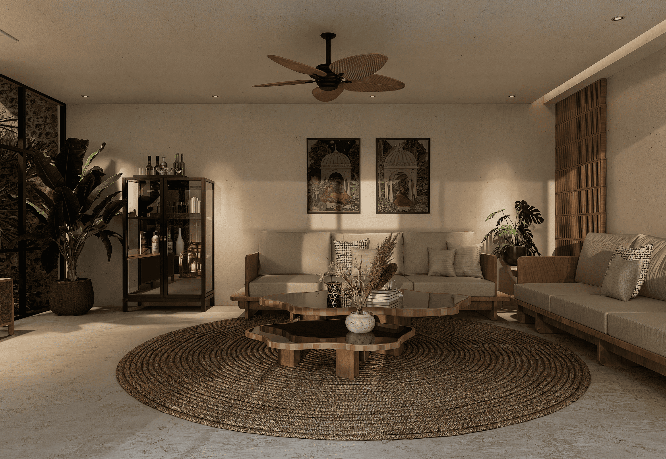The living room embodies a refined tropical aesthetic that blends comfort with natural elegance. Featuring earth-toned textures, rattan accents, and handcrafted wooden furniture, the space radiates warmth and tranquility. The woven circular rug and organic coffee table design anchor the layout, while curated art and indoor greens enhance the sense of serenity. With diffused lighting and soft shadows, this living room becomes a perfect sanctuary for relaxed resort living.