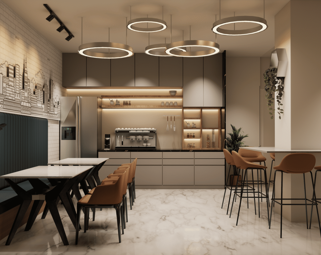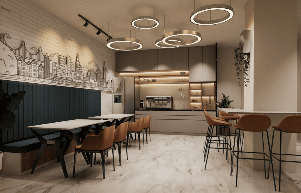 This breakout zone redefines the modern workspace by introducing warmth, comfort, and visual rhythm. Circular pendant lights soften the geometry of the space, creating an inviting setting for informal discussions and collaborative breaks.