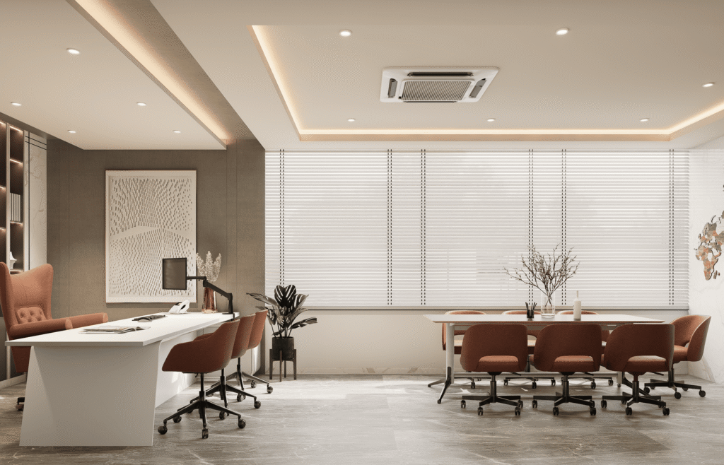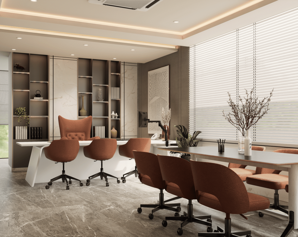 This office interior exemplifies the ethos of elevated simplicity through its seamless blend of functionality, natural light, and timeless design. The open-plan workstation is accentuated by linear LED fixtures and fluted detailing that lend rhythm and hierarchy.