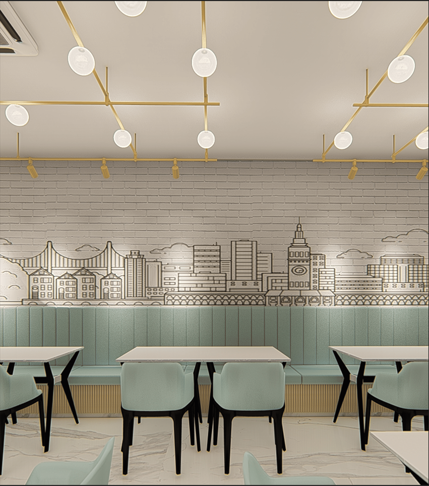 Soft mint seating pairs with warm brass accents, while the matte brick backdrop introduces texture and depth. Every element — from the lighting alignment to the seating layout — is orchestrated to encourage interaction and comfort. Designed as a moment of pause within a structured workspace, this zone blends artistry with functionality, embodying a sense of modern composure.