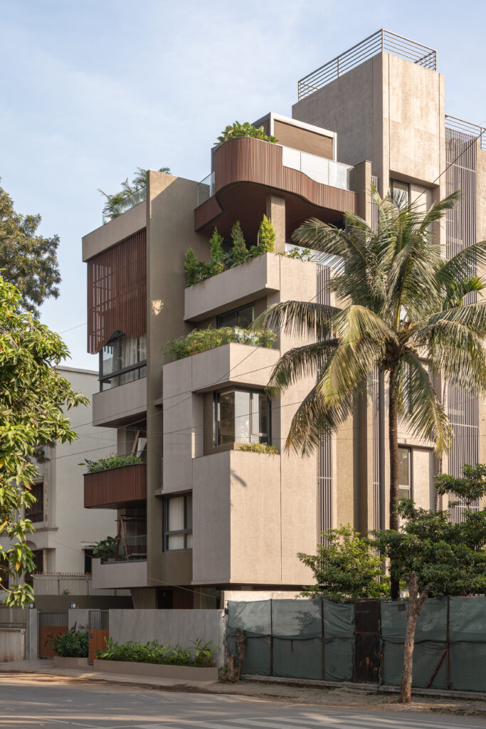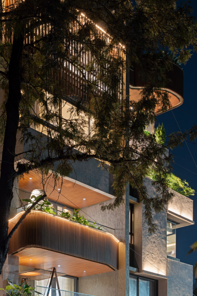 Warm-toned materials and minimalist detailing lend a grounded elegance to the elevation, softened by vertical greens that anchor the structure to its environment. Each level communicates with the next through subtle design continuities, fostering a sense of unity and vertical flow.