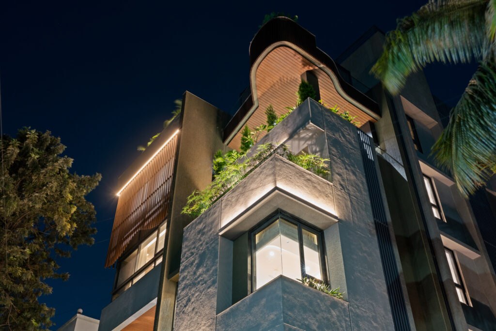 This 7BHK bungalow redefines urban luxury through vertical spatial planning and biophilic design integration. The facade is sculpted with interlocking volumes, textured stone cladding, and wooden fins that filter light while maintaining privacy. Each level opens to landscaped terraces, creating a layered connection between indoors and outdoors. The design balances minimal geometry with natural warmth, establishing a seamless dialogue between architecture, structure, and the surrounding greenscape.