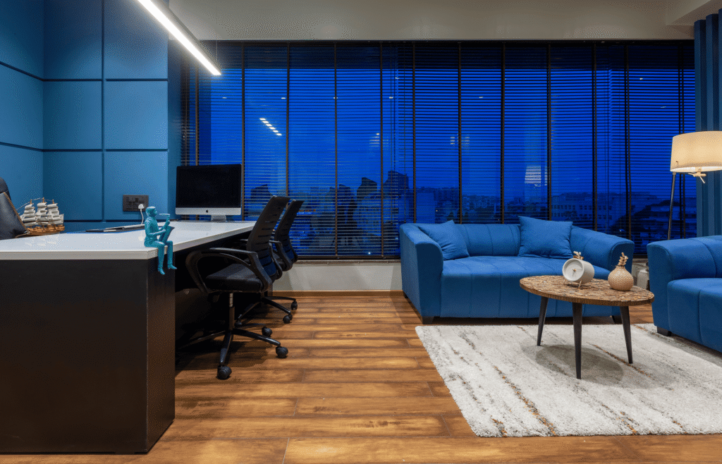 A deep blue acoustic grid wall anchors the space, providing both sound insulation and visual depth. The linear ceiling light underscores geometric precision while maintaining uniform brightness across the workspace. Natural wood flooring and minimal ornamentation establish balance between corporate discipline and warmth.