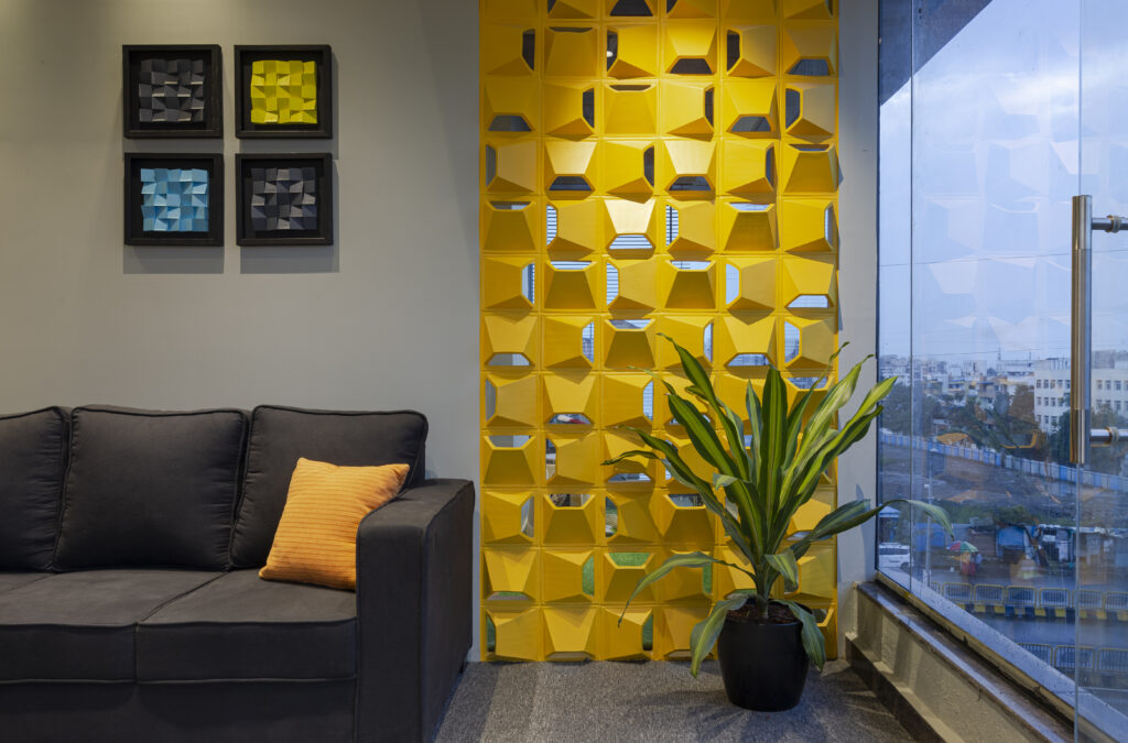 The reception and waiting lounge embrace vibrancy through form and color. A sculptural yellow screen divides the space with a rhythmic geometry that filters light while maintaining visual connection. This element not only energizes the environment but also introduces a distinct spatial identity aligned with the client’s forward-thinking ethos.