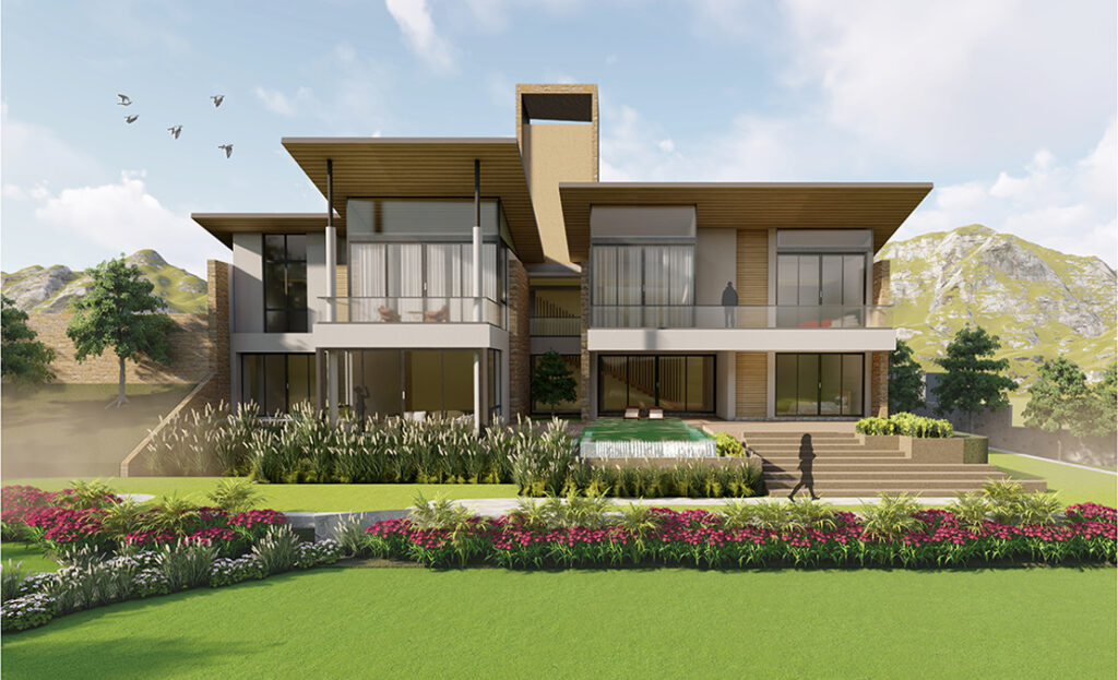 Material choices reflect warmth and regional sensitivity, stone textures, timber finishes, and neutral tones merge seamlessly with the natural palette outside. Wide terraces and projecting balconies extend the living experience outdoors, blurring the threshold between architecture and nature.