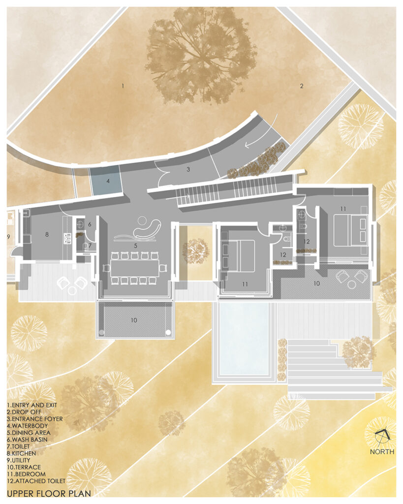 Every spatial element has been planned with precision — double-height volumes enhance scale and connection, while extended rooflines and wooden cladding lend warmth to the contemporary form. The architecture prioritizes both privacy and openness, establishing a sense of retreat without compromising elegance.