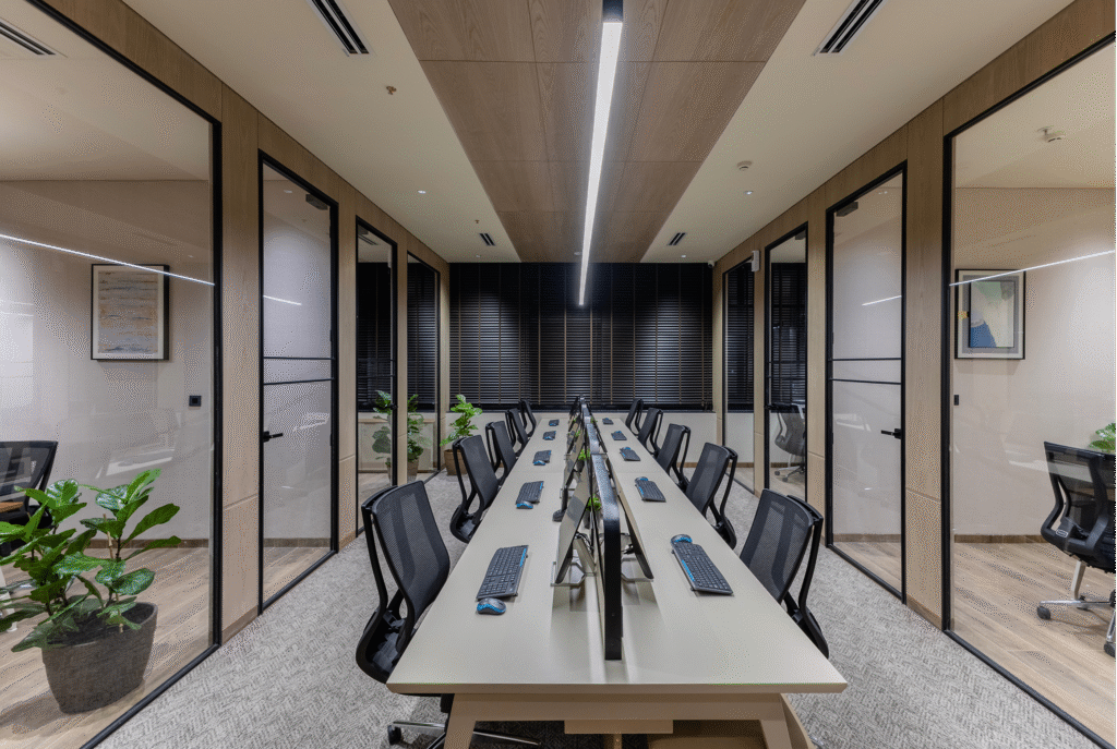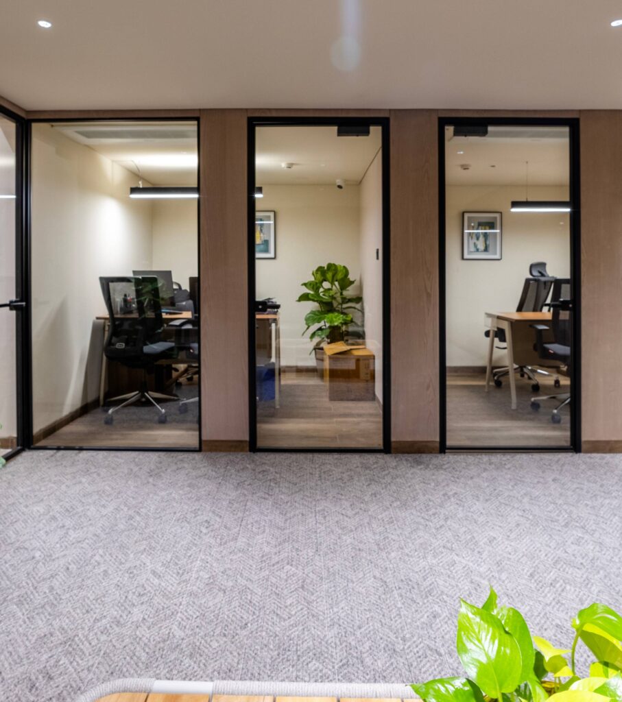 The trio of glass-lined cabins forms a structured spine within the workspace, offering quiet zones for focused tasks while maintaining visual openness. Each room is defined by clean vertical frames, minimal décor, and controlled lighting that ensures clarity without glare.