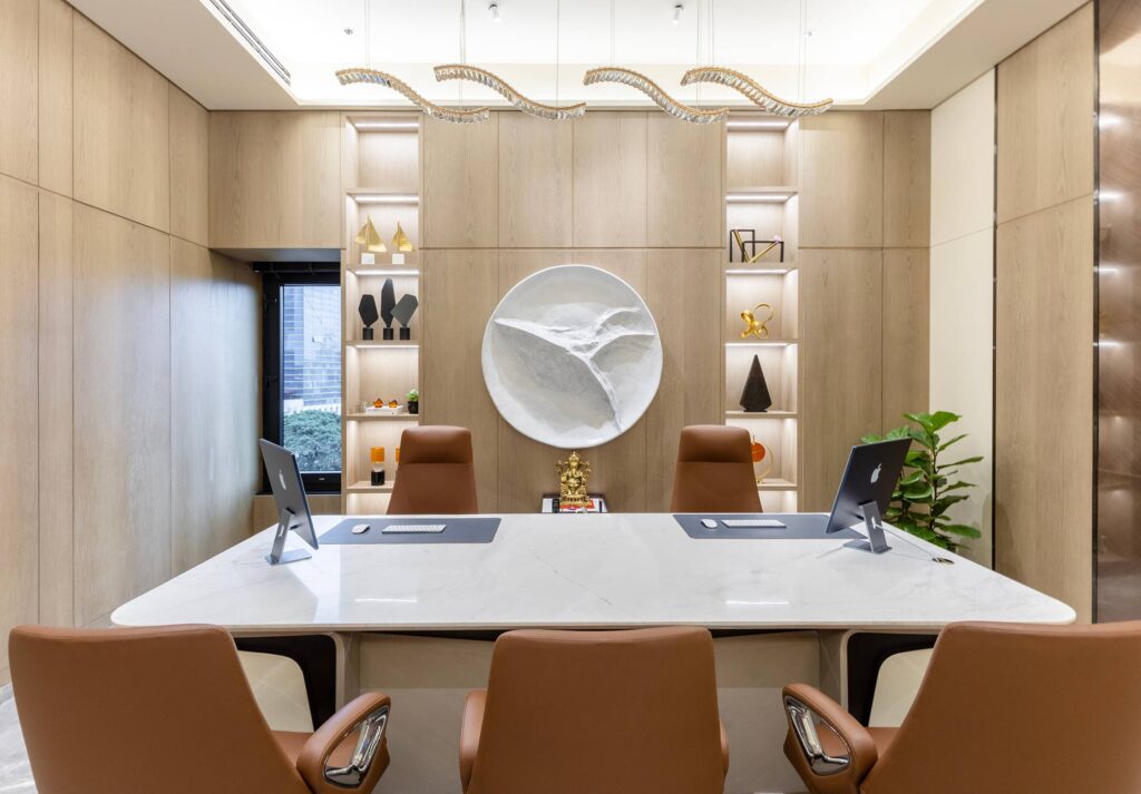 The meeting room exemplifies quiet sophistication—wrapped in muted tones and minimal detailing, it sets the stage for focused collaboration. A custom marble table anchors the space, surrounded by warm leather chairs that blend comfort with elegance. Subtle lighting and built-in shelving with curated accents add layers of character, creating a setting that feels both professional and personal.