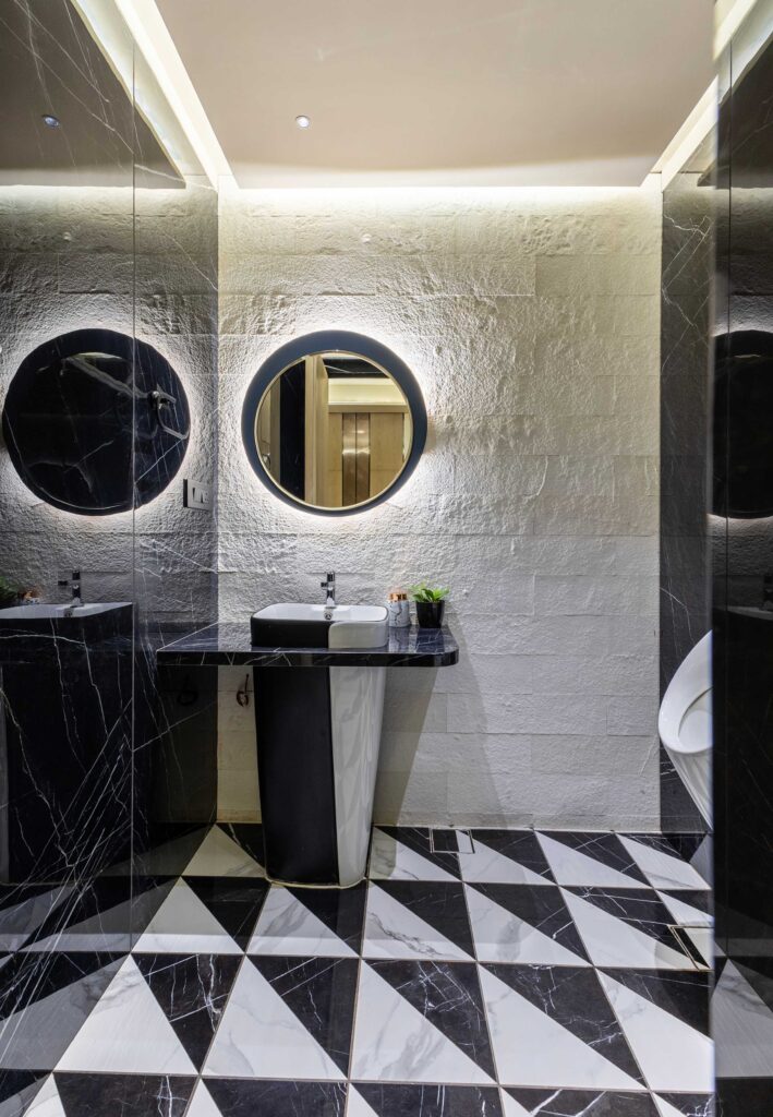 Breaking conventions of corporate washroom design, this bold restroom at the Vision Group Head Office is a striking interplay of monochrome geometry and luxe finishes. The dramatic black-and-white patterned flooring anchors the space with graphic energy, echoed by sleek marble surfaces and an angular basin pedestal. Soft cove lighting, textured stone walls, and a circular mirror create a delicate counterbalance — elevating this functional space into one of quiet sophistication and sharp design intent.