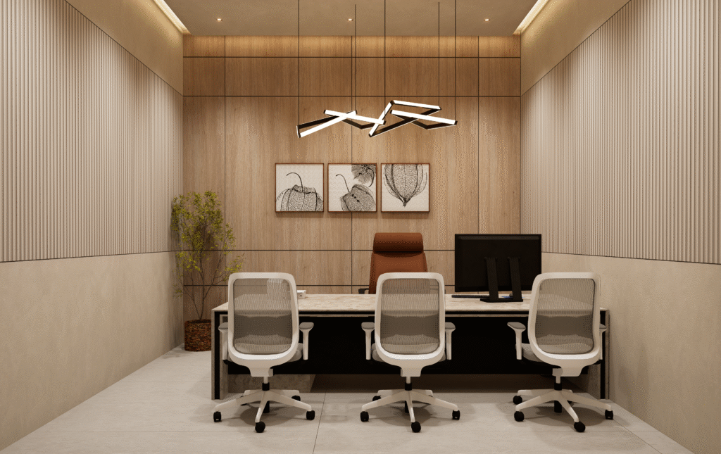 At the heart of the office lies the director’s cabin, designed as an emblem of authority balanced with composure. A veneer-wrapped wall anchors the space, complemented by recessed lighting that accentuates its material depth.