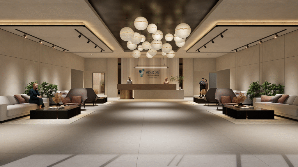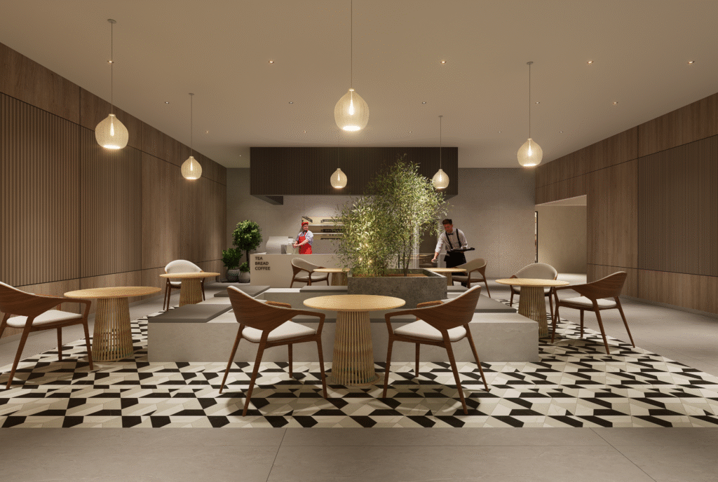 Inside, the space unfolds with a hospitality-inspired design approach where form, function, and feeling converge. The ground floor features a central experience zone showcasing architectural models and brand communication walls, illuminated by a balance of natural light and pendant fixtures.