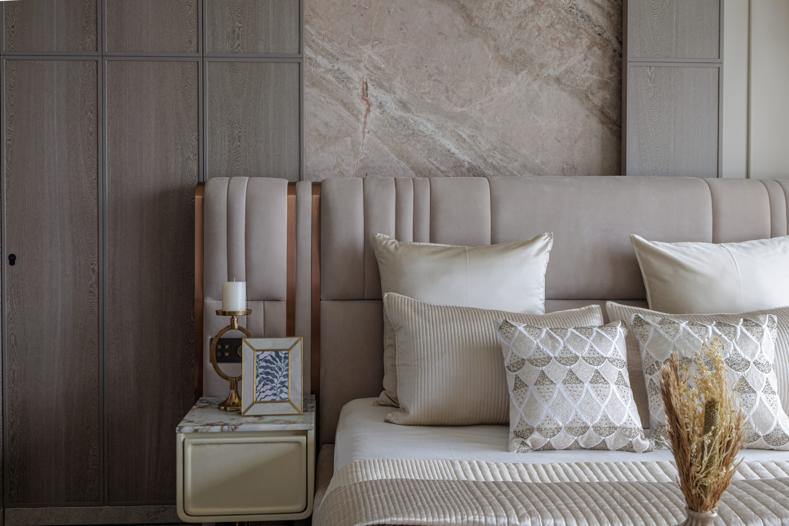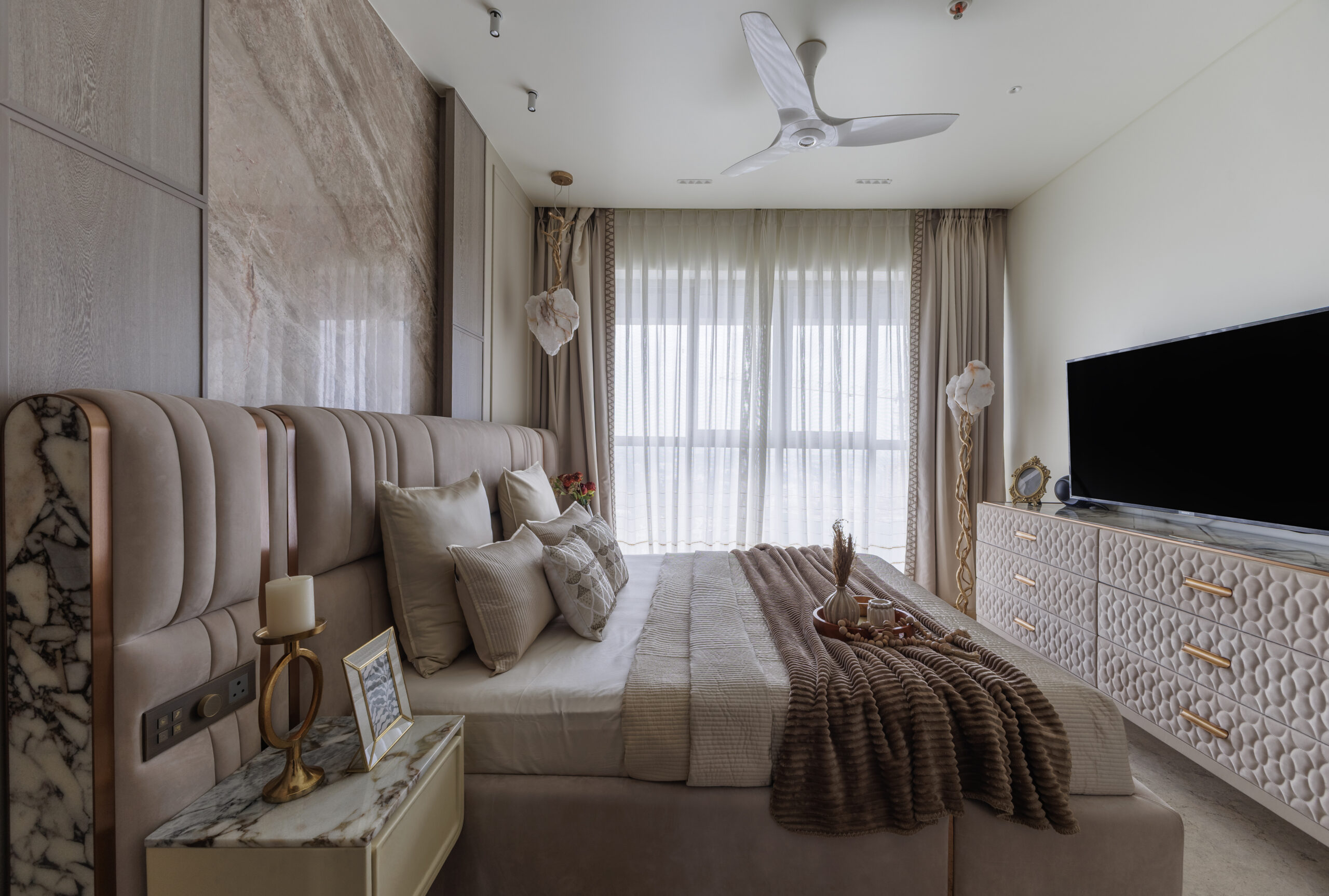 The master bedroom is a sanctuary of calm and understated luxury. A full-height channel-tufted headboard in fluted panels creates a plush backdrop, while the washroom is cleverly concealed behind a flush, handle-less door with a fine shadow gap, maintaining the room's serene continuity. Integrated side tables, a sculptural pendant over the nightstand, and full-height curtains further enhance the minimal, muted, and restful ambiance. Every detail in this room speaks of impeccable style and uncompromising comfort.