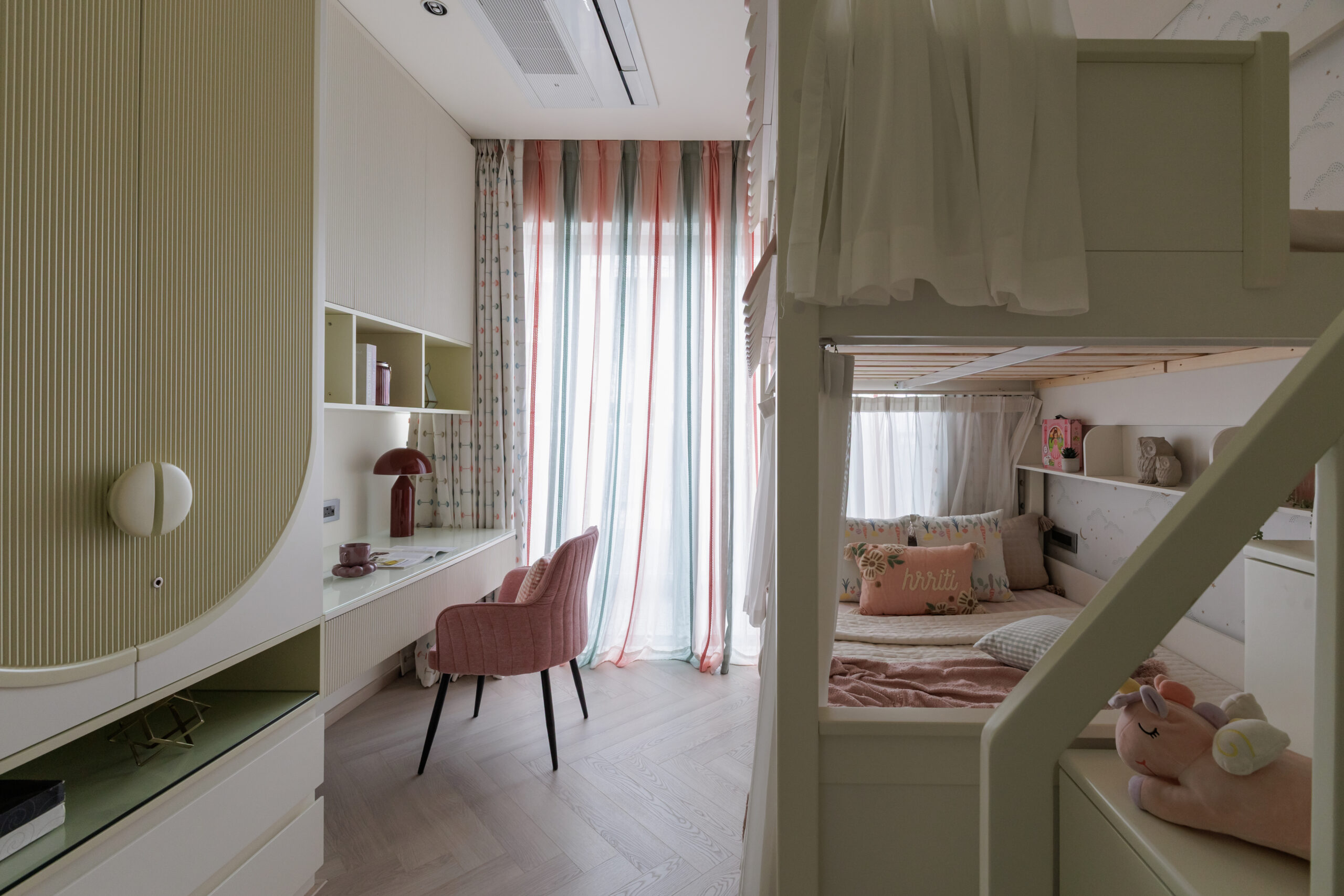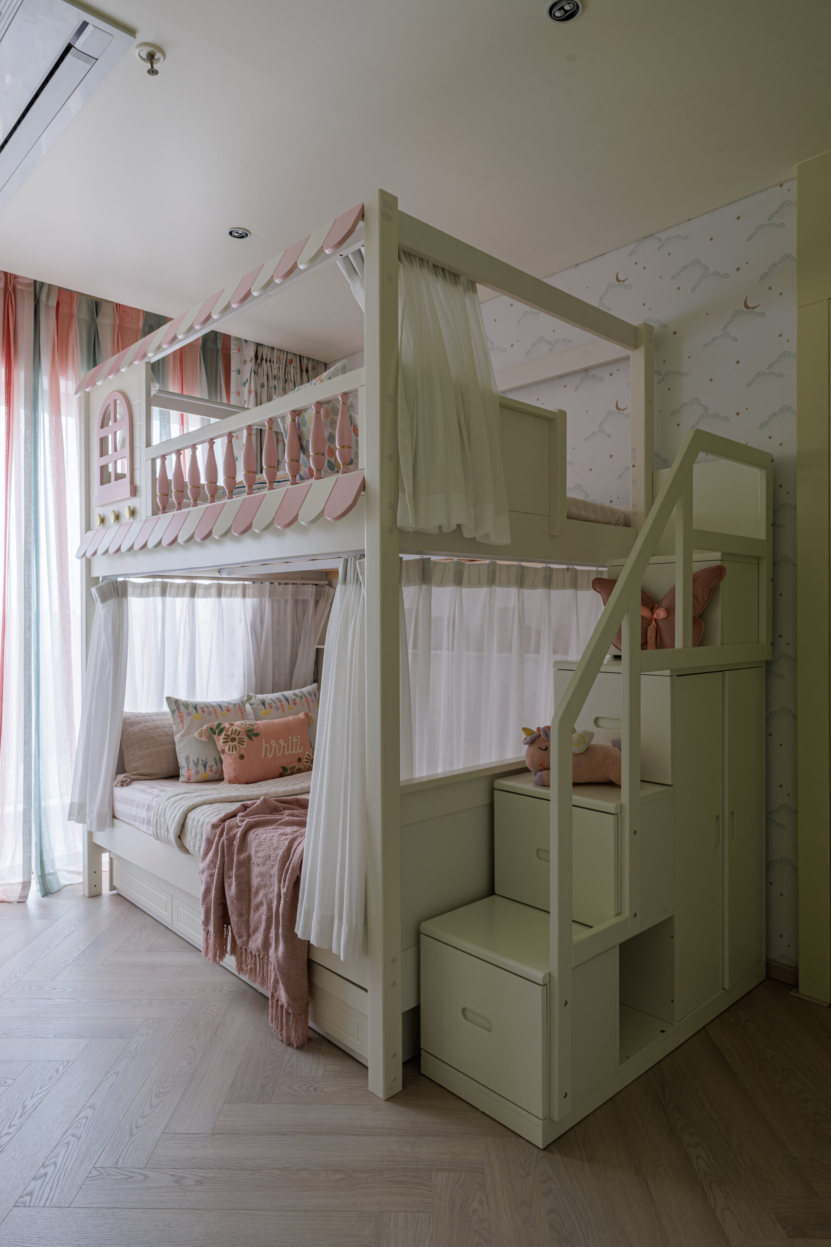 Even the children's spaces have been meticulously designed to inspire wonder and provide ultimate comfort. We've created a pastel cottage bunk with a charming scalloped bed, complemented by a built-in study opposite. Herringbone flooring adds a touch of classic elegance, while striped sheers and a concealed AC ensure an airy, cozy, and safe environment. This space is a harmonious blend of playfulness and practicality, designed to spark joy and creativity.