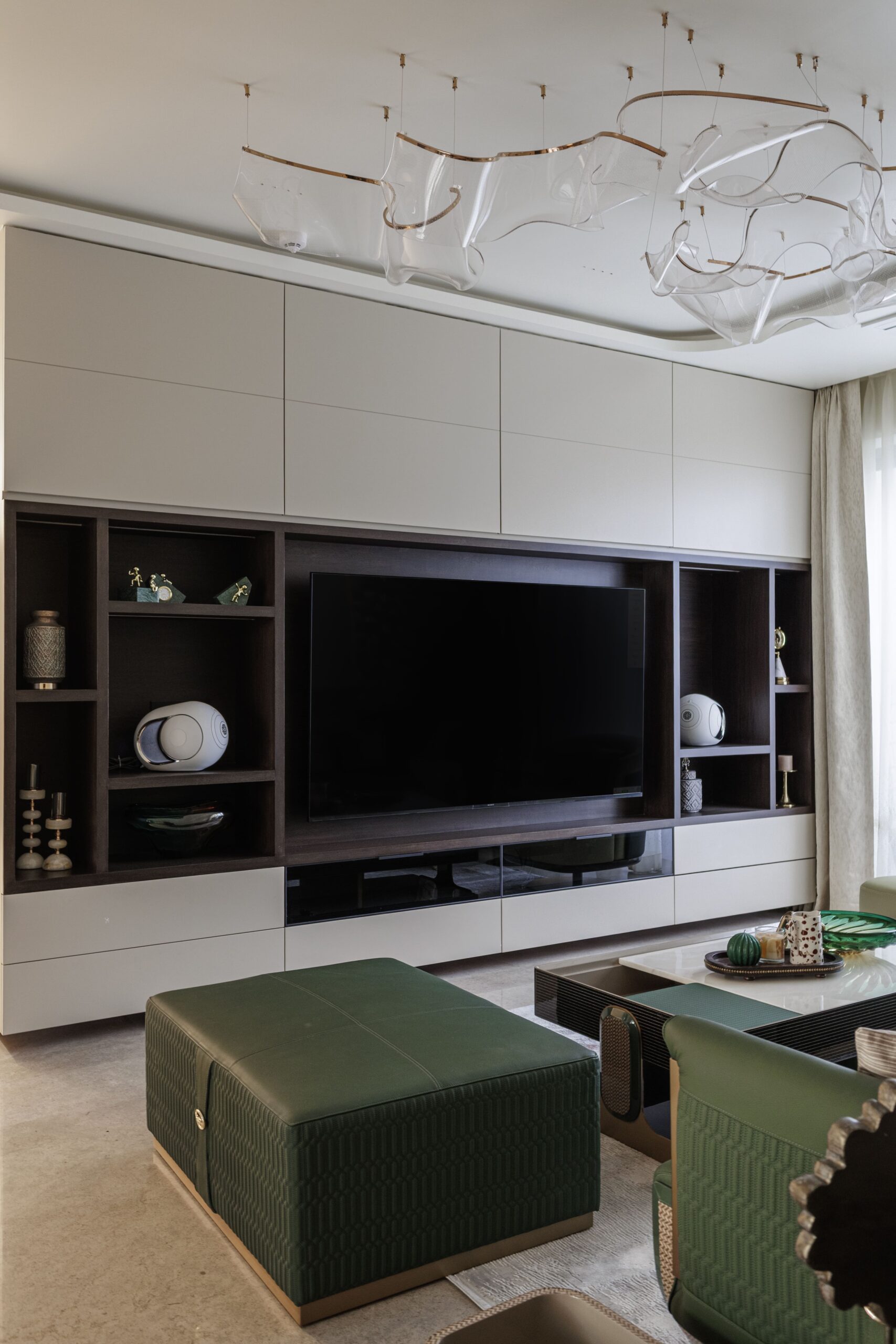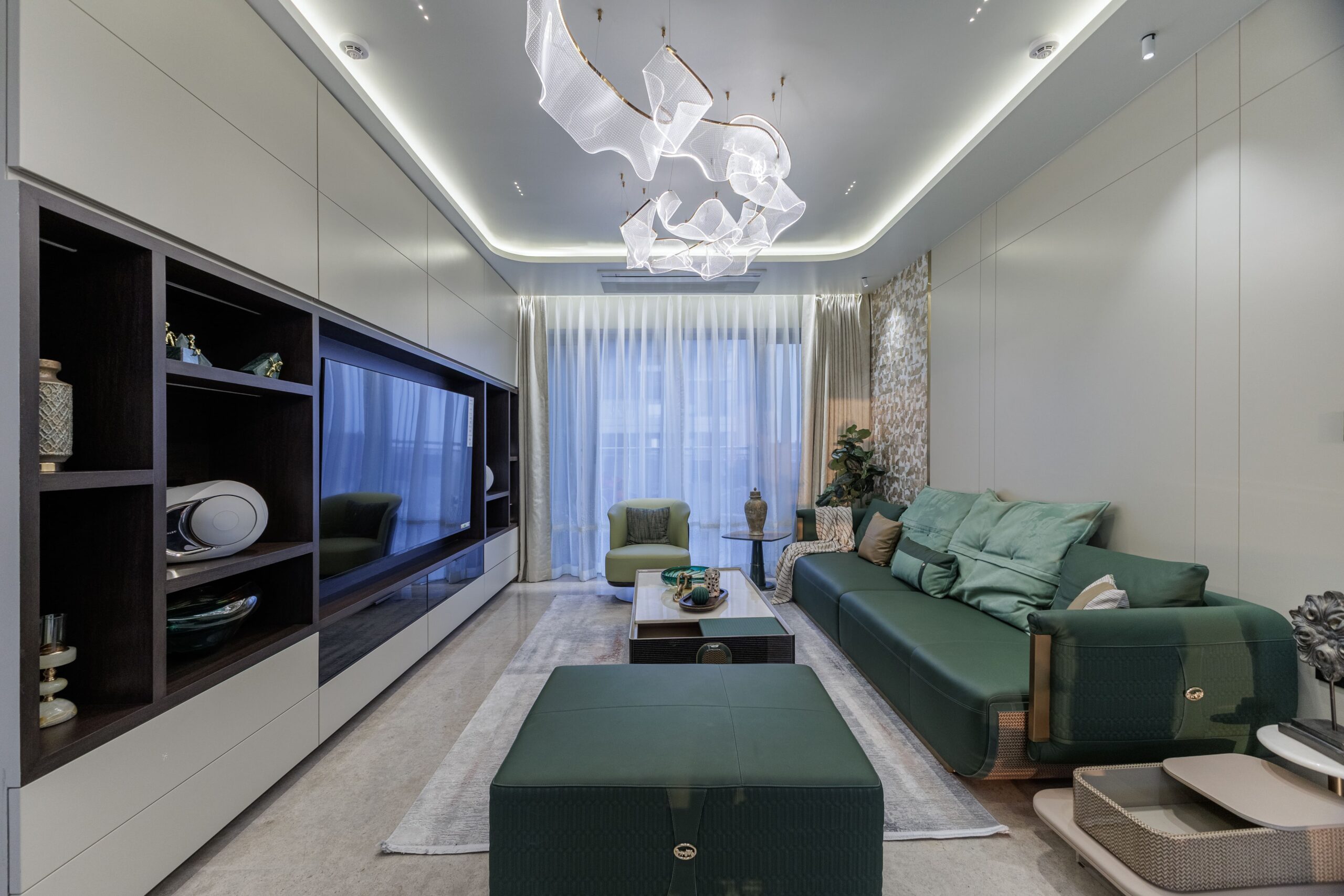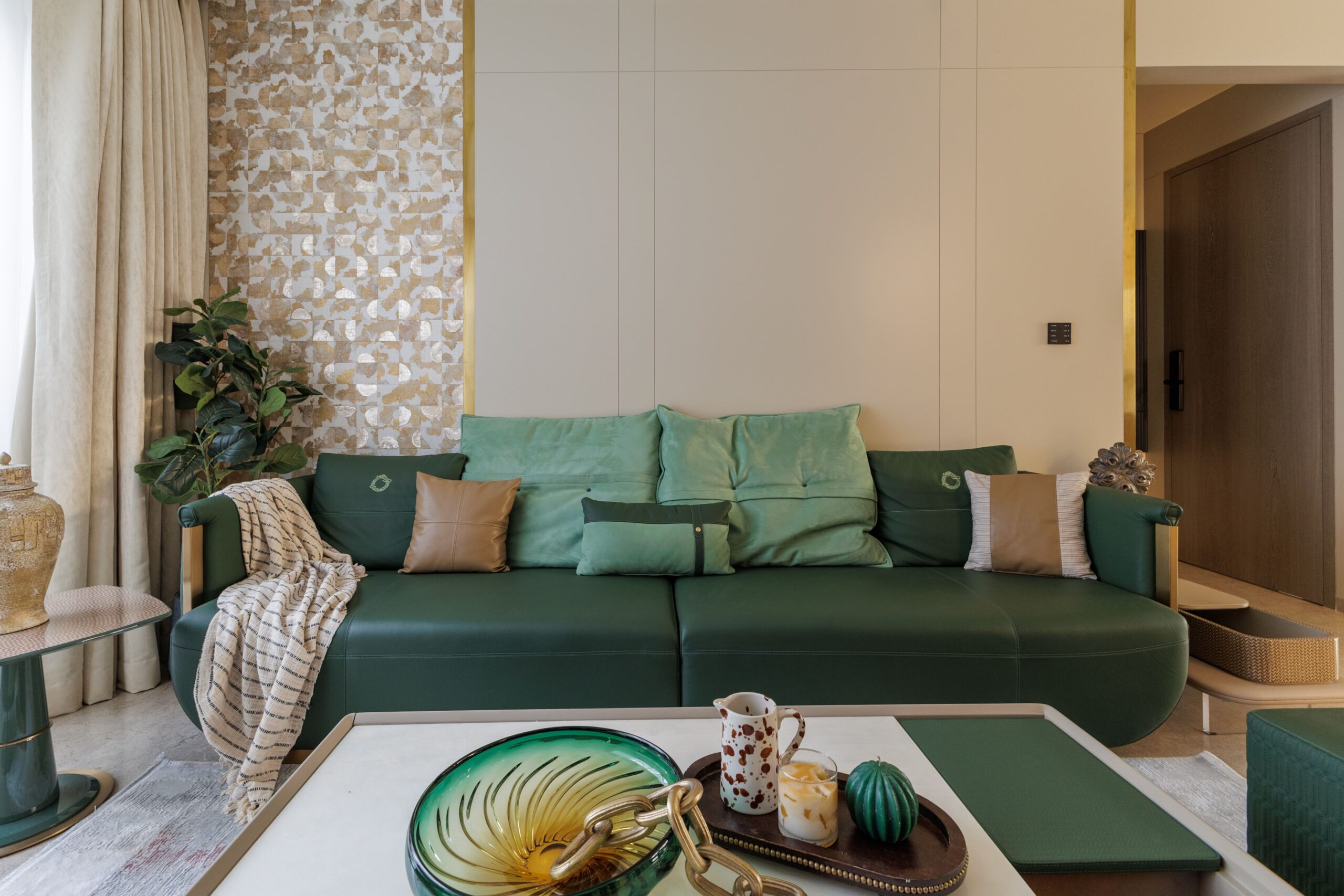 The living area instantly captures attention, setting the tone for the entire residence. Our design philosophy here was to create a space that exudes warmth and opulence simultaneously. The custom green leather sofa, with its elegant brass details, becomes the focal point, bathed in golden-hour sunlight that highlights its exquisite texture.