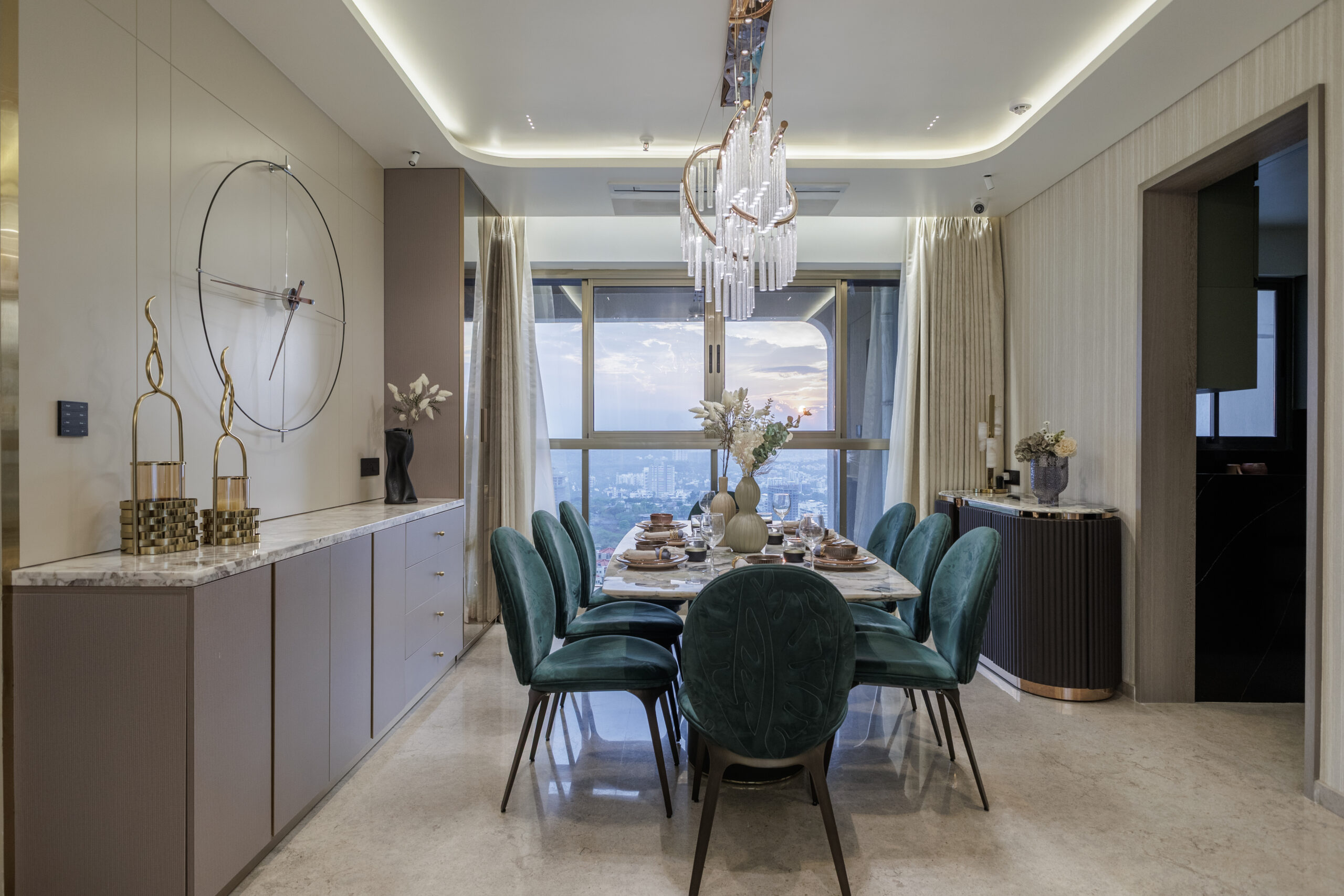 The dining room at the Gandhi Residence is a masterpiece of design, conceived for both grand entertaining and intimate family meals. This modern luxury space features an eight-seater stone-top table on brass-detailed bases, surrounded by sculpted oval-back upholstered chairs in a rich emerald velvet that exudes opulence. A long buffet with a round mirror and exquisite decor accents, along with a statement chandelier and recessed ceiling, complete the cohesive and elegant setting. Every element, from the stemware to the unique wall art, contributes to an ambiance ripe for unforgettable gatherings.